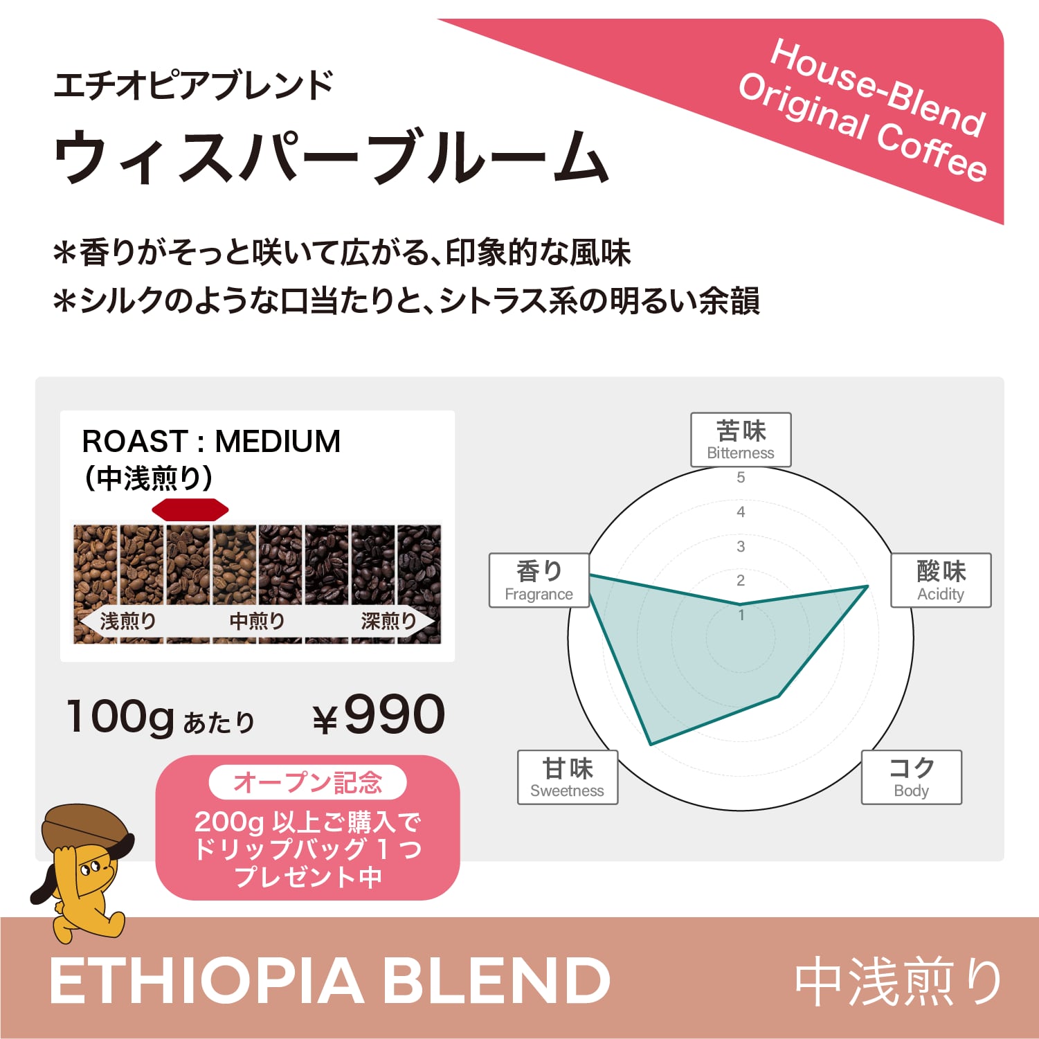 エチオピア ブレンド ウィスパーブルーム(浅煎り)100g〜/コーヒー豆・粉